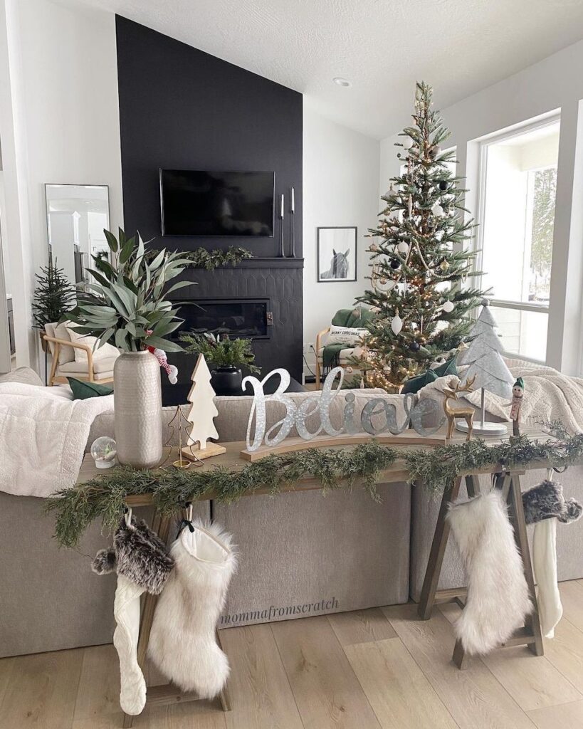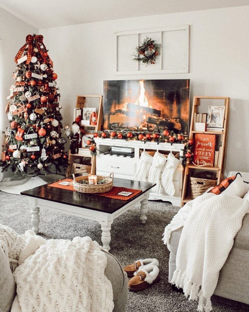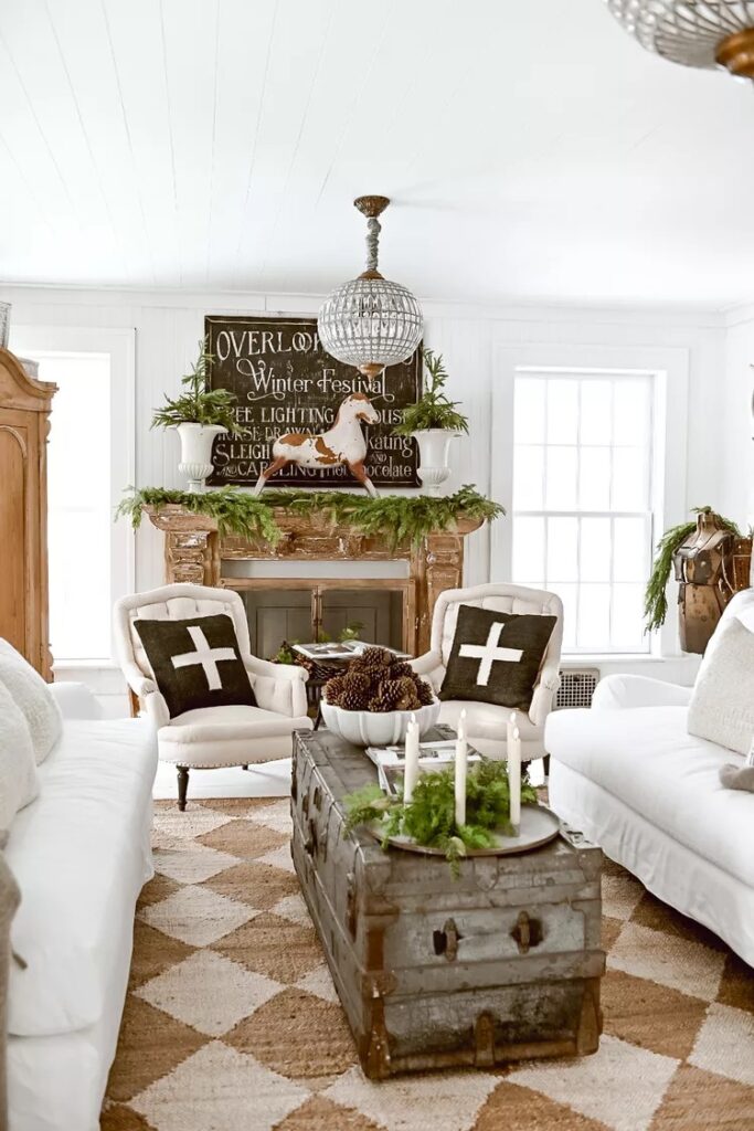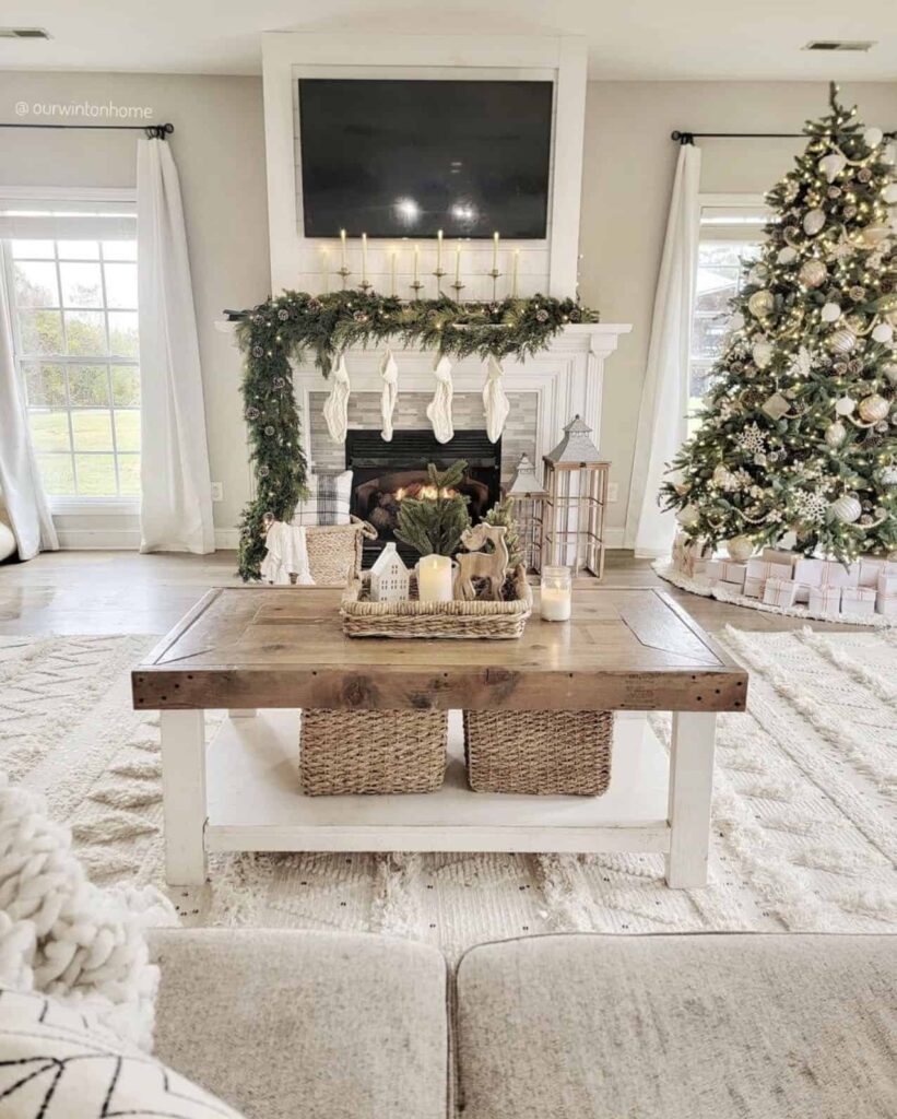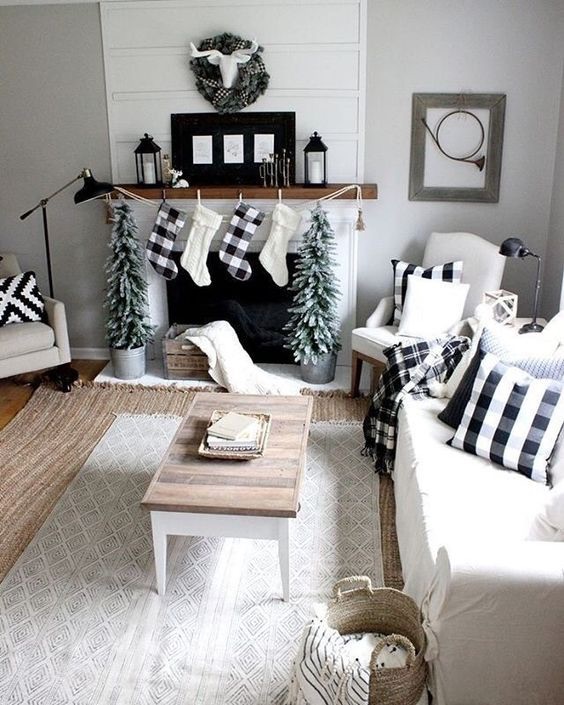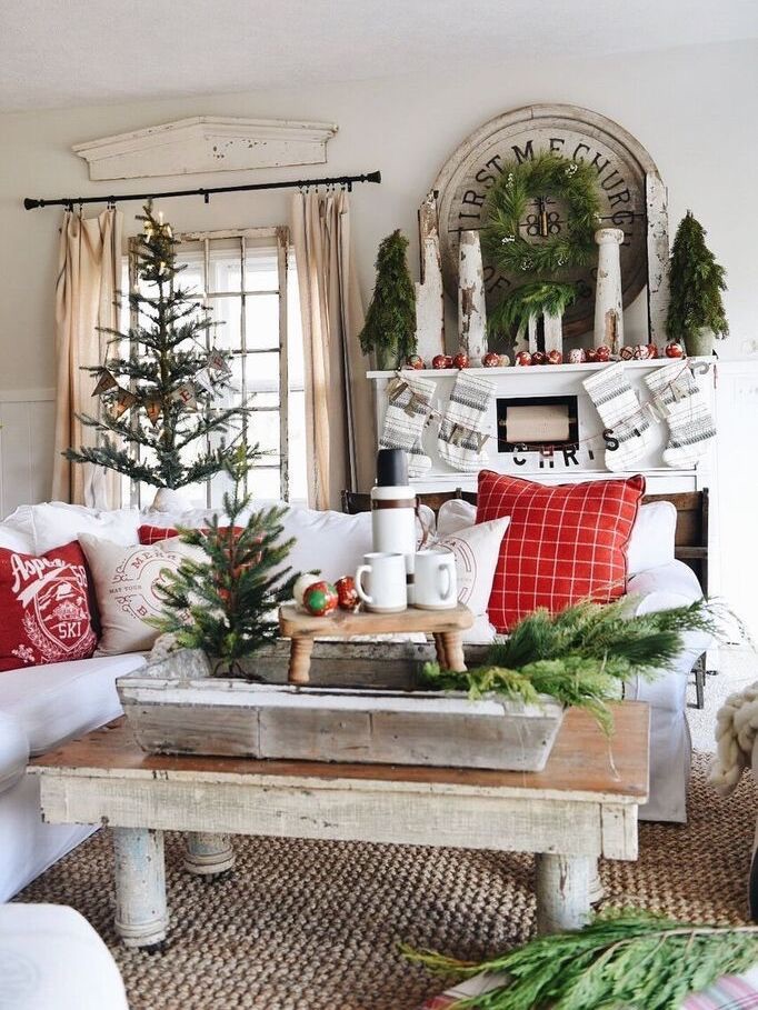 You can place your ornaments on the fireplace with them carrying that nice red or green color. Plantsis also very needed in that area. Incorporate these lovely farmhouse table for a vintage vibe. The rug can also share the same color as the table for a unique look.