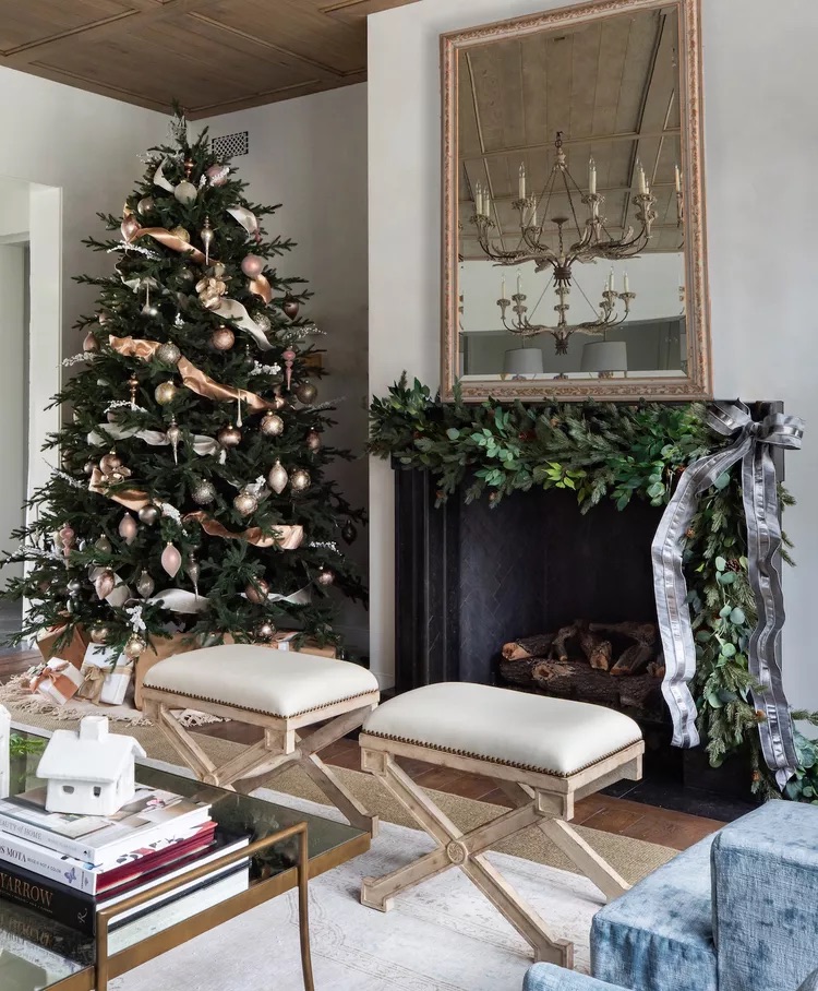 Not all trees have to be a standing one, you can just set up a rope across your fireplace, you can hang your tree and other items on the rope. A traditional mat can replace your regular center rug if you want a more traditional style.