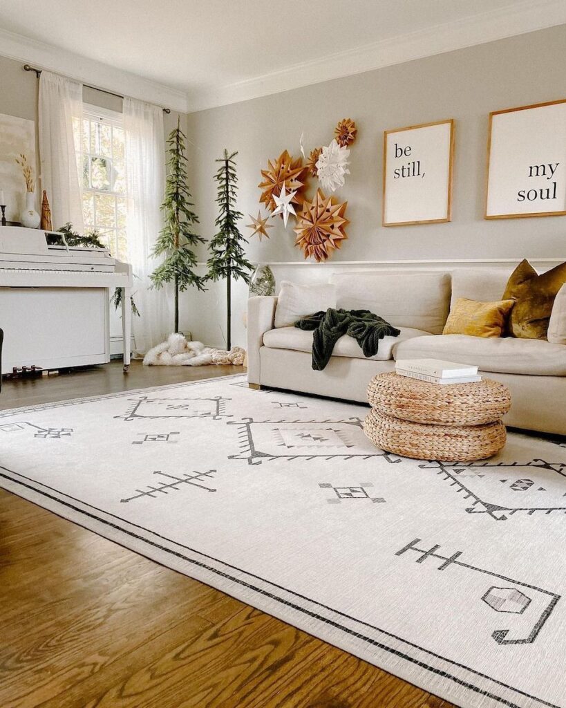 A white rug, brightly painted wall and white couch should be the perfect combination for that look you’re trying to achieve. You can opt for a white tree to make everything unique but you can also go for a green one to keep that area different.