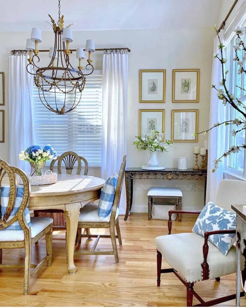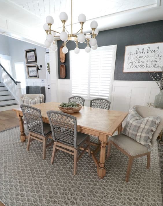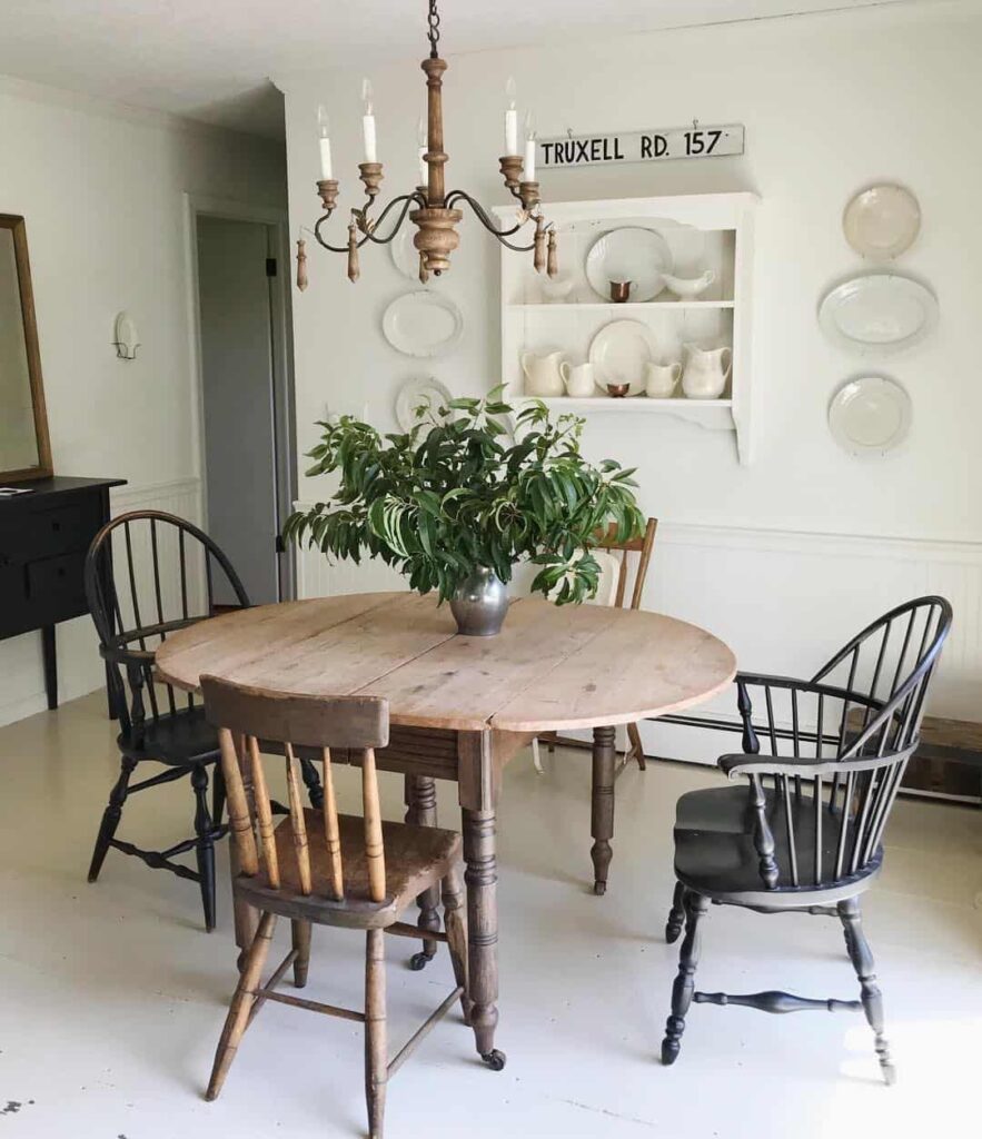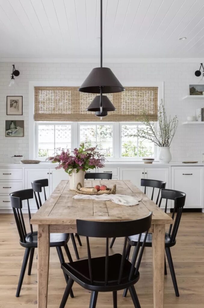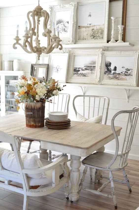 If you’re going for this mixture then let the chairs be in a modern design and the table carry the farmhouse material. Get a vintage glass or any vintage material as your vase for the centerpiece, you’ll place your lovely plant in that vintage vase and your design is complete.