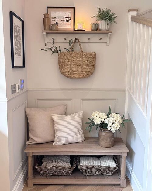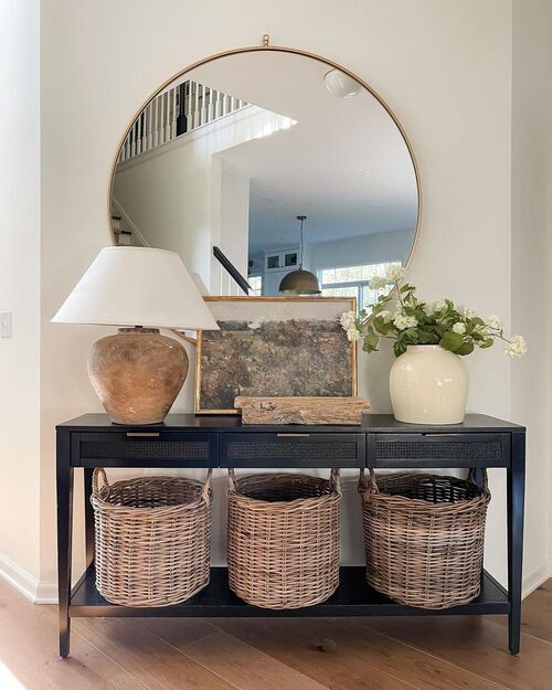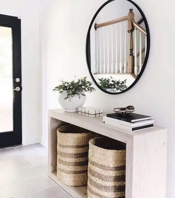 You can place shoes or smaller items in your wicker baskets. A table can be made specifically for your entrance, you’ll place your plant pots, wall arts and the wicker baskets on or bellow this table, this makes everything look whole.