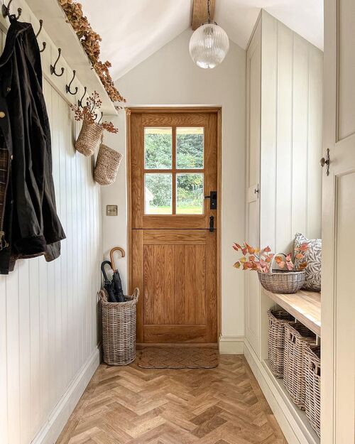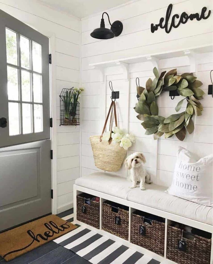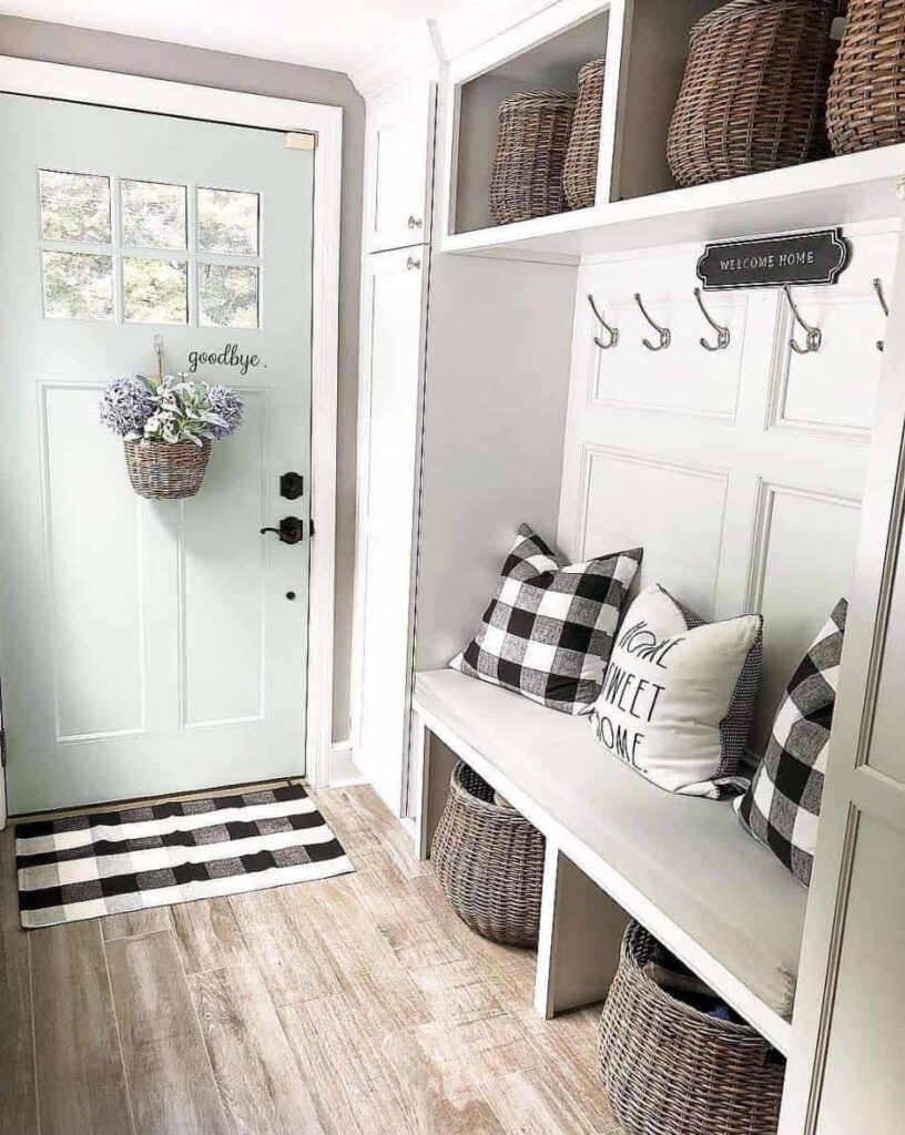 A wooden bench would not just serve as a place to put your plant pots but also as something to sit on while you’re putting on your shoes. It’ll be nice to place your shoes in a wicker basket, which helps to save space. Plant pots should be considered if you want to make that area lively.