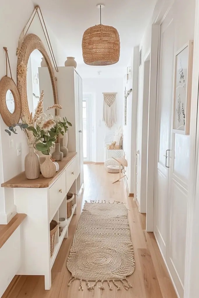 A brown rug would be perfect especially when you’re trying to incorporate wicker basket. A small bench is a great choice so you can place your items under it. You can also decide to place another wall art there, and a regular one this time.