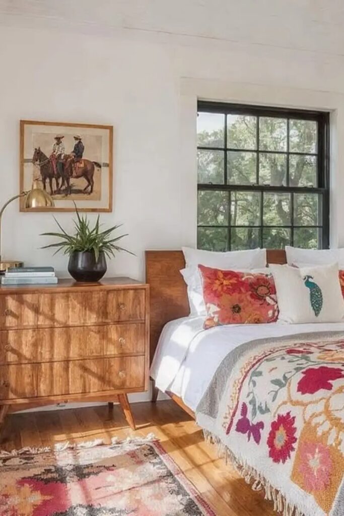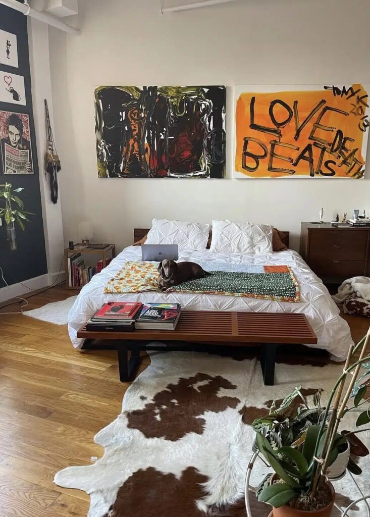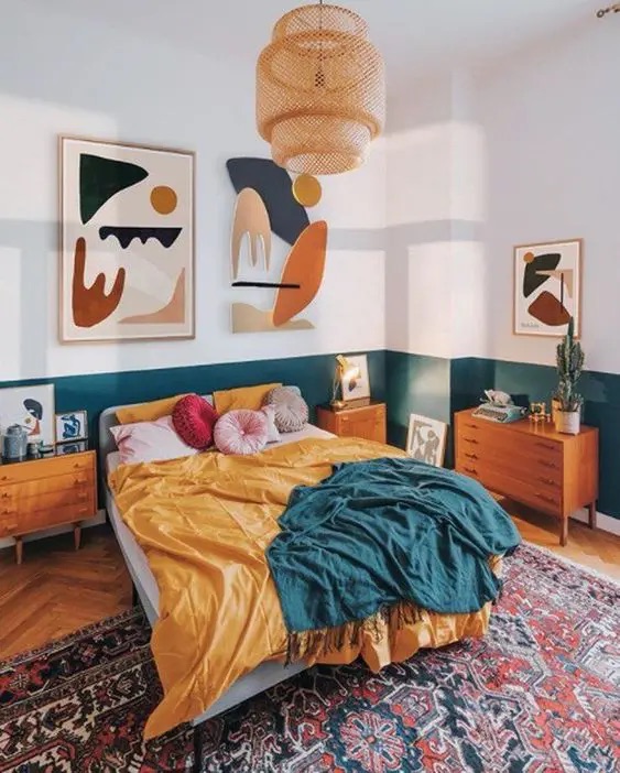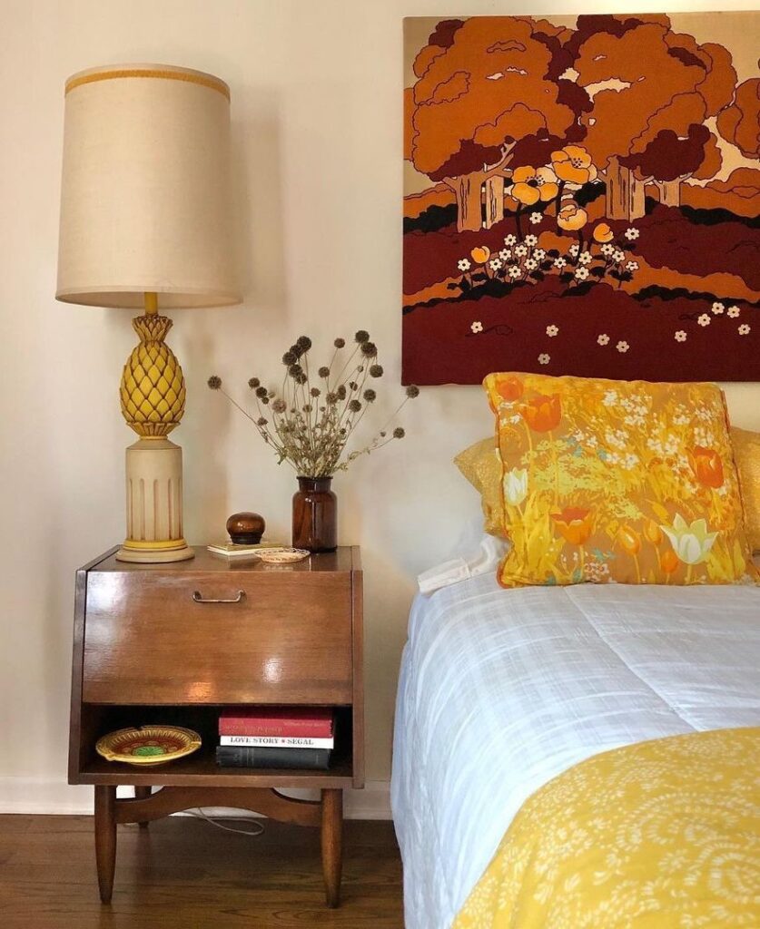 If you notice, the wall art has very similar color as the center rug and the bed material. This is a great idea if you want that unique look. If you’re going for a nice vintage style then you’ve got to consider plants, plants are up there with the best vintage items.