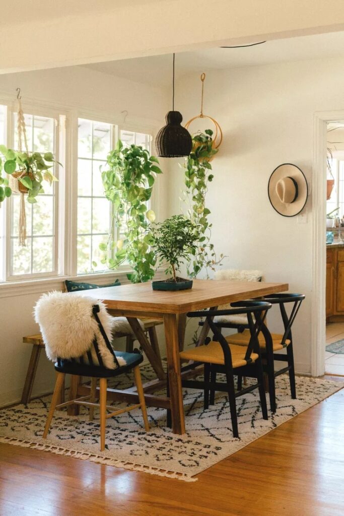 There’s no bohemian decoration without the mat, the mat is very important and it contributes to the beauty overall. Your plants are also important, you can place as many plants as you want. Your chairs should be wooden as that should match the other items.