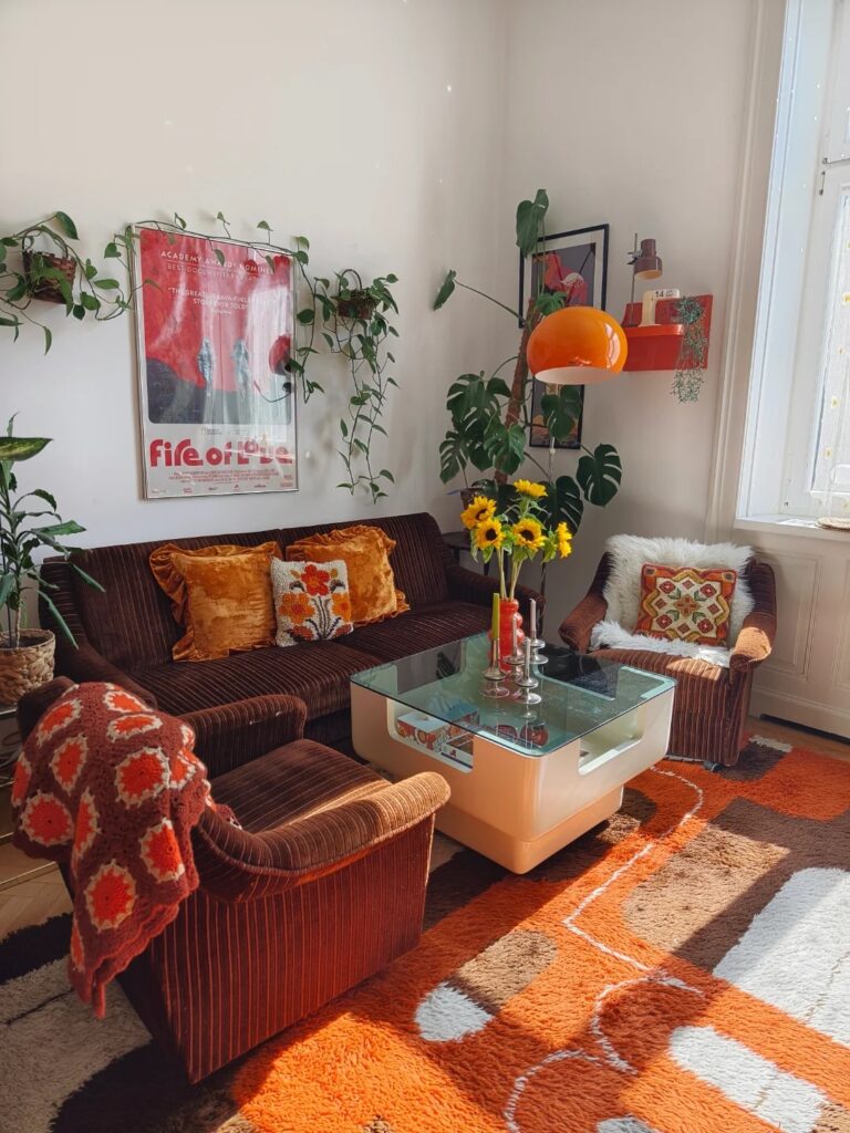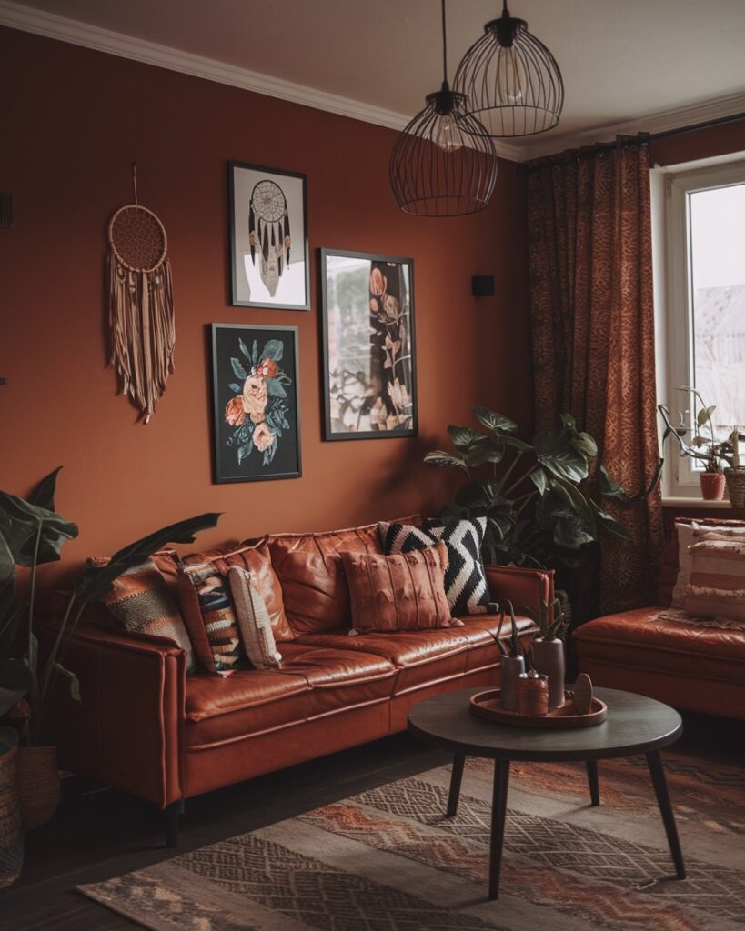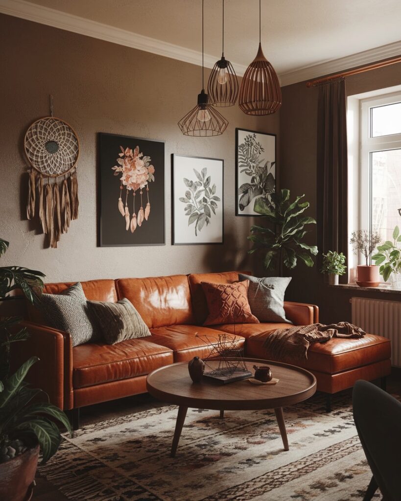 A brown couch along with a nice bohemian rug would be a great idea if you’re not going for a full Modern style, you can also mix it up if you like a mid century modern design. Pick nice plants to use preferably something that has similar colors as your furniture.